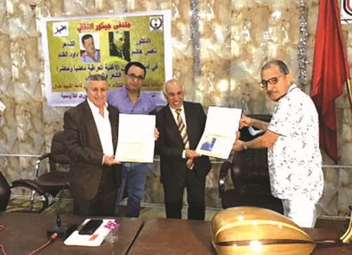 وفي الختام، قدم عضو الهيئة الإدارية للملتقى، باسم محمد حسين، شهادتي تقدير للضيفين.