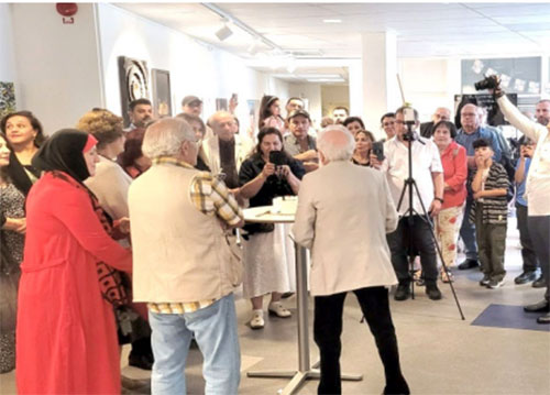 بعدها جرى قطع كيكة ميلاد الجمعية الـ25، ليتحدث الفنان عماد الطائي، وهو من مؤسسي الجمعية، عن عطاء جمعيته، مثمنا أدوار زملائه الفنانين. وتصدرت المعرض لوحة بورتريه للفنان الفقيد وسام، من إبداع الفنان نوري عواد. وامتدت إلى جانبها أعمال الفنانين المشاركين، التي بلغت حوالي 30 عملا بين الرسم والسيراميك والحرق على الخشب والخط والزخرفة والتصوير الفوتوغرافي. وجاءت الأعمال بأحجام وموضوعات ومستويات مختلفة. وكشف جميعها عن قدرات فنية وإبداعية متطورة. فيما عكست موضوعاتها تشبث الفنانين المغتربين بوطنهم وتراثه وتاريخه وحضارته. وفي سياق المعرض، جرت نقاشات فنية بين الفنانين المشاركين، وهم كل من رائد حطاب، سام ويس، سندس تمروز، ازدهار اسامة، مارسلين ايليا، وصفي الهلالي ، شاكر عطية، وفاء غالب، سليمة السليم، انتصار ذو النون، لمياء سيف، كابي ساره، عماد زبير، سميرة ايليا، نوري عواد، آلاء دوكله، مؤيد سام، عباس عباس، عماد الطائي، عمر العاني، هبة سعدون، بسام ناجي والفقيد وسام الناشي الذي عُرض آخر عمل له.