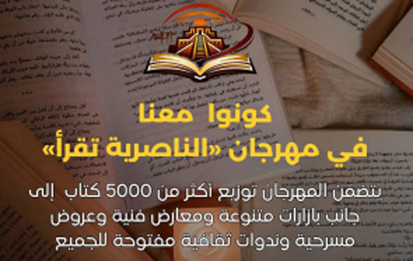 تحتضن مدينة الناصرية غدا الجمعة، مهرجان "الناصرية تقرأ" الثقافي، الذي يُقام بتنظيم مشترك بين اتحادي الشبيبة الديمقراطي العراقي والطلبة العام في جمهورية العراق، وذلك على كورنيش المدينة.