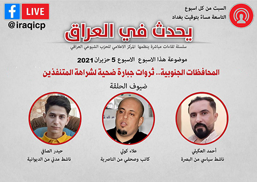 خصص المركز الاعلامي للحزب الشيوعي العراقي، حلقته الأسبوعية من برنامج “يحدث في العراق” السبت الماضي، للوقوف على أوضاع المحافظات الجنوبية في ما يتعلق بعمل الحكومات المحلية  على صعيد الخدمات ومشاريع الإعمار، وبالحراك الاحتجاجي. وقد ضيّفت الحلقة التي حملت عنوان “ المحافظات الجنوبية.. ثروات جبارة ضحية شراهة المتنفذين”، الناشط السياسي أحمد العكيلي، والناشط المدني حيدر الصافي، والكاتب والصحفي علاء كولي. فيما أدار الحلقة عضو اللجنة المركزية للحزب علي صاحب.