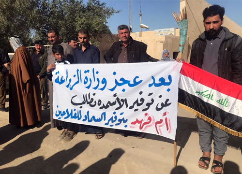 وفي محافظة النجف، تظاهر العشرات من المزارعين امام شعبة زراعة العباسية، مطالبين الحكومة بصرف مبالغ التعويضات للسنوات الماضية وتزويدهم بالاسمدة للموسم الزراعي الحالي.