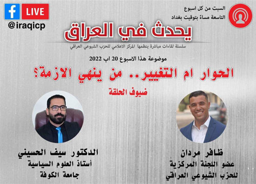 ضمن سلسلة حلقات برنامج (يحدث في العراق) الذي يبث عبر صفحة الحزب الشيوعي العراقي على فيسبوك، بتنظيم من المركز الإعلامي للحزب، ضيّف البرنامج السبت الماضي، عضو اللجنة المركزية للحزب الشيوعي العراقي، الرفيق ظافر مردان، واستاذ العلوم السياسية في جامعة بابل الدكتور سيف الحسيني، للحديث عن تطورات المرحلة السياسية، ودعوات الحوار من قبل المتنفذين. وحاورهما الزميل الصحفي سيف زهير.