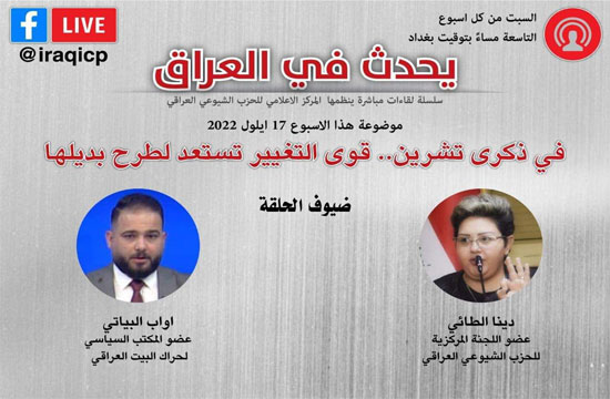 ضمن سلسلة حلقات برنامج (يحدث في العراق) الذي يبث عبر صفحة الحزب الشيوعي العراقي على فيسبوك، بتنظيم من المركز الإعلامي للحزب، ضيّف البرنامج السبت الماضي، عضو اللجنة المركزية للحزب الشيوعي العراقي الرفيقة دينا الطائي، وعضو المكتب السياسي لحراك البيت العراقي أواب البياتي، للحديث عن الدروس المستفادة من انتفاضة تشرين، والبدائل التي من الممكن ان تقدمها القوى المدنية في مواجهة قوى المحاصصة والفساد.