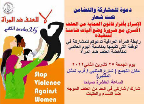 ليس سهلا ان نستقبل اليوم العالمي لمناهضة العنف ضد المرأة 25 تشرين الثاني ونحن نشهد ارتفاع مخيف في معدلات العنف في العراق، أذ لازالت البيوت العراقية تشهد مظاهر مرعبة للعنف تكون ضحيتها الاولى النساء، كل يوم نصدم باشكال أكثر خطورة على حياة المرأة ومستقبل الاسرة العراقية في آن واحد، امام فشل كبير وواضح في وضع واتخاذ اجراءات رادعة تجرم مرتكبي جرائم العنف الموجه ضد النساء والفتيات وتحاسب مسببيها بالشكل الذي يضمن الحد منها.