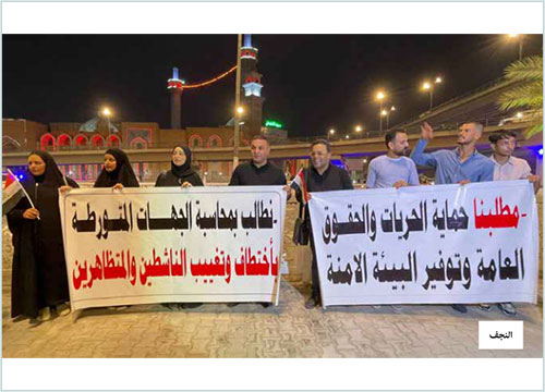 نظم العشرات من المواطنين في محافظة النجف وقفة احتجاجية تحت مجسرات ثورة العشرين مطالبين بالكشف عن مصير نشطاء الحركة الاحتجاجية المغيبين.