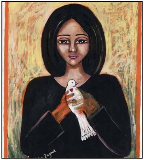 وجه آخر في تشكيل هبة زقوت يحمل رسالتها أيضا، المرأة التي ترسمها بوجهٍ مبتسم ومستسلم وآمن، وجه الأم المُسالم والمعطاء والكريم، بين الوجه الطفولي ومقياس الجمال التقليدي يحضر وجه المرأة في لوحات هبة. والجسد أقوى من الوجه، وبلا قياسات واضحة ومثالية تصنعه بانطباعية حرة، بحواف شبه صلبة وقاسية كدلالة لجسد المرأة القوية والقادرة. أما رسالة المرأة فهي دوما خلفها أو في يديها، كأن تمسك بيد فتى يرفع نبتة، أو امرأة تحمل حمامة سلام، ولا تتردد بأن تضع قلبا واضحا في اللوحة. بساطة اللوحة والتعبير تتراكم عبر اللوحات، المرأة عند زقوت تملك هوية بصرية وهوية فردية. تكرر هذه الرسالة وتتنوع عند هبة، فالجسد يجسد صلابة المرأة الفلسطينية، أما الوجه فروح الصبر والسلوان. الدراما التي تتكاثف في التكرار تصبح سردا، من امرأة الحصاد الفرحة، المحاطة بالبيوت، إلى المرأة المحتضنة للطفل، للفتى، وللأرض. تنتقل المرأة في لوحات هبة زقوت إلى عالم إدراكي وإبداعي تقول فيه إن دور المرأة الفلسطينية يشكل فلسطين ذاتها. حتى أنها تقسم اللوحة وتزخرفها بوصفها تعددا للأمكنة والأزمنة، من زراعة الأرض، إلى الشتاء والماء، إلى احتفالات الحصاد، إلى البيوت المختلفة الإنشاء والزينة.