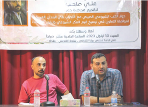 احتضنت قاعة منتدى “بيتنا الثقافي” في بغداد، أخيرا، محاضرة حول “حوار الحزب الشيوعي الصيني مع الأحزاب السياسية في البلدان العربية لمواصلة التعاون في ترسيخ قيم الفكر الشيوعي وتبادل الثقافات”، قدمها عضو المكتب السياسي للحزب الشيوعي العراقي الرفيق علي صاحب، على ضوء مشاركته في الحوار الذي عُقد في الصين من 7 إلى 14 تموز الماضي.